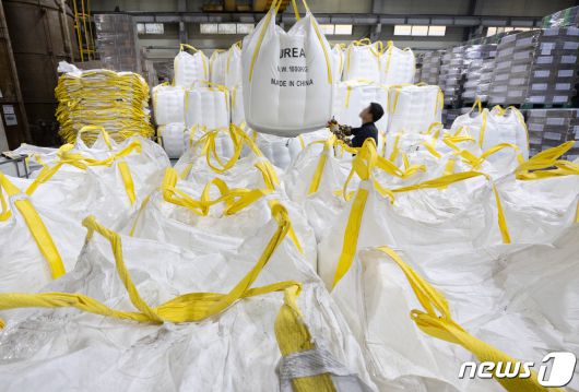 (안산=뉴스1) 이재명 기자 = 6일 경기도 안산시 단원구 금성이엔씨에 차량용 요소수 원료인 요소가 쌓여 있다. 정부는 중국발 요소 통관 지연 사태에 따른 국내 수급 안정을 위해 공공비축분을 늘리고, 베트남 등으로부터의 대체 수입량을 확대하기로 했다. 이어 "차량용 요소의 안정적 수급에 문제가 없으니 국민들께서도 안심하고 필요한 물량만 구매해 달라"라고 당부했다. 2023.12.6/뉴스1