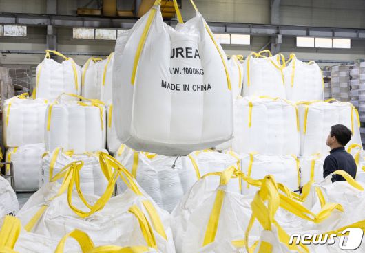 (안산=뉴스1) 이재명 기자 = 6일 경기도 안산시 단원구 금성이엔씨에 차량용 요소수 원료인 요소가 쌓여 있다. 정부는 중국발 요소 통관 지연 사태에 따른 국내 수급 안정을 위해 공공비축분을 늘리고, 베트남 등으로부터의 대체 수입량을 확대하기로 했다. 이어 "차량용 요소의 안정적 수급에 문제가 없으니 국민들께서도 안심하고 필요한 물량만 구매해 달라"라고 당부했다. 2023.12.6/뉴스1