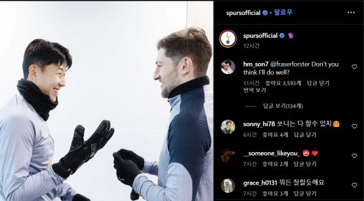 '포스터, 내가 잘 할 것 같지 않아?'란 손흥민 멘션도 옆에 달았다. 포스터는 토트넘 백업 골키퍼 프레이저 포스터를 말한다.