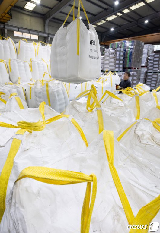 (안산=뉴스1) 이재명 기자 = 6일 경기도 안산시 단원구 금성이엔씨에 차량용 요소수 원료인 요소가 쌓여 있다. 정부는 중국발 요소 통관 지연 사태에 따른 국내 수급 안정을 위해 공공비축분을 늘리고, 베트남 등으로부터의 대체 수입량을 확대하기로 했다. 이어 "차량용 요소의 안정적 수급에 문제가 없으니 국민들께서도 안심하고 필요한 물량만 구매해 달라"라고 당부했다. 2023.12.6/뉴스1