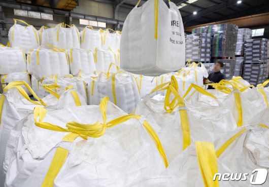 (안산=뉴스1) 이재명 기자 = 6일 경기도 안산시 단원구 금성이엔씨에 차량용 요소수 원료인 요소가 쌓여 있다. 정부는 중국발 요소 통관 지연 사태에 따른 국내 수급 안정을 위해 공공비축분을 늘리고, 베트남 등으로부터의 대체 수입량을 확대하기로 했다. 이어 "차량용 요소의 안정적 수급에 문제가 없으니 국민들께서도 안심하고 필요한 물량만 구매해 달라"라고 당부했다. 2023.12.6/뉴스1