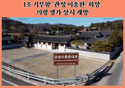 의령군은 지난 9월 13일 향년 100세로 별세한 삼영그룹 고 이종환 회장 뜻을 기리고, 수려한 경관과 이 회장 유지가 깃든 공간을 군민과 관광객들에게 널리 알리고자 '관정 이종환 생가'를 상시 개방한다. 이번 생가 상시 개방은 생전 이 회장이 오태완 의령군수에게 한 약속이다.