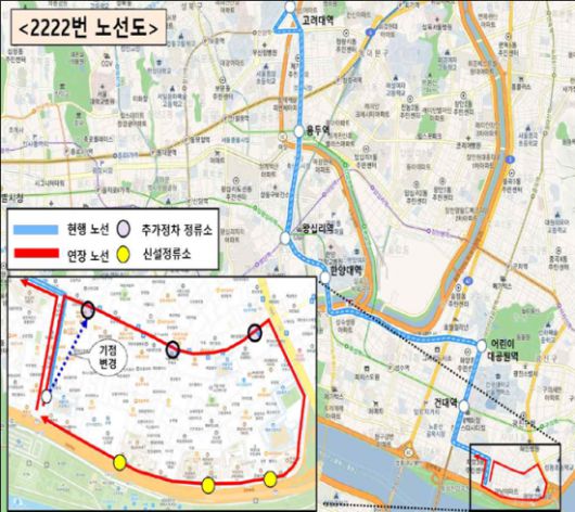 연장되는 2222번 버스 노선은 광진구 구간에서 총 28곳의 정류소에 정차하게 된다.