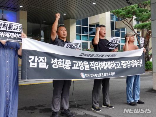 노조는 "지난 4일 제주시 지역 모 고등학교 A교장의 제주도교육청 감사관실 조사가 마무리돼 해당 학교로 통보 공문이 발송됐다"며 "당연히 중징계를 예상했지만 경징계였다. 있을 수 없는 일"이라고 항의했다.