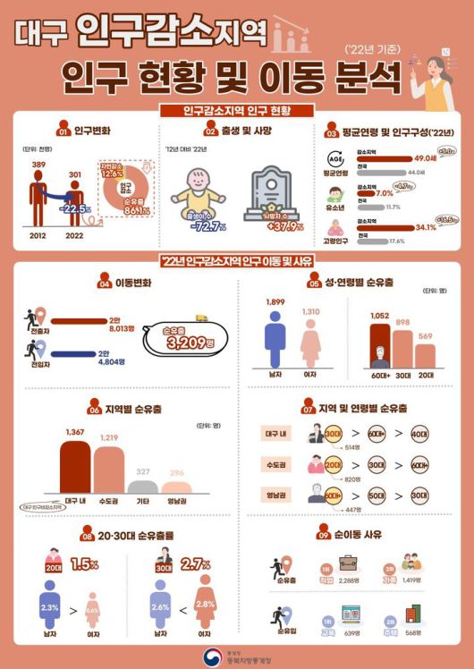 지역별로 보면 대구 내 인구비감소지역으로 1367명이 순유출했다. 수도권은 1219명, 충청권, 호남권, 강원, 제주 등 기타가 327명이다. 연령별로 보면 대구 내로는 30대(514명), 60대 이상(474명), 40대(154명) 순으로 순유출했다. 수도권으로는 20대(820명), 영남권으로는 60대이상(447명), 50대(344명)의 순유출이 높게 나타났다.