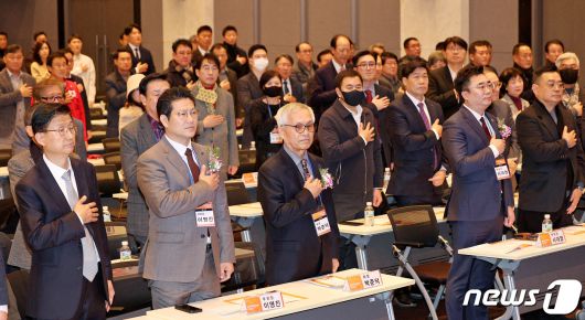 6일 오후 서울 마포구 중소기업 DMC타워에서 열린 소소뱅크 출범식에서 박준덕 설립준비위원회장 등 참석자들이 국민의례를 하고 있다. 2023.12.6/뉴스1 ⓒ News1 장수영 기자 |