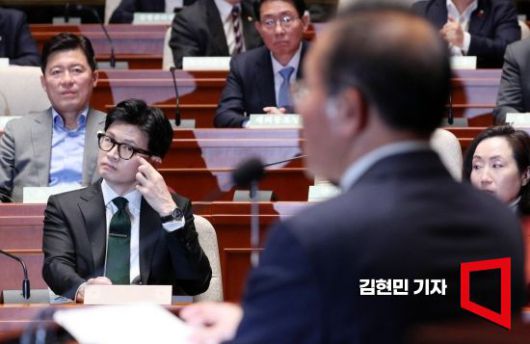 한동훈 법무부 장관이 6일 국회 예결위회의장에서 열린 국민의힘 정책의원총회에서 윤재옥 원내대표의 발언을 듣고 있다. 사진=김현민 기자 kimhyun81@ <ⓒ투자가를 위한 경제콘텐츠 플랫폼, 아시아경제(www.asiae.co.kr) 무단전재 배포금지>