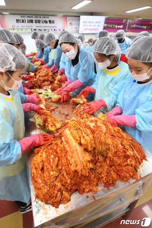 (대구=뉴스1) 공정식 기자 = 6일 오후 대구 중구 봉산동 경북사대부설초등학교에서 열린 '온(溫) 사랑 김장 나눔' 행사에 참여한 학생·학부모와 교사들이 교내 텃밭에서 직접 가꾼 무·배추로 김장을 하고 있다. '2023 경대사대부초 사랑나눔 교육기부'의 일환으로 이날 담근 김장김치는 인근 복지관을 통해 지역 홀몸어르신에게 전달할 예정이다. 2023.12.6/뉴스1