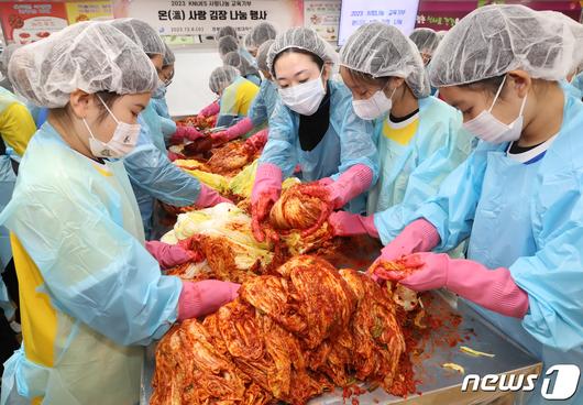 (대구=뉴스1) 공정식 기자 = 6일 오후 대구 중구 봉산동 경북사대부설초등학교에서 열린 '온(溫) 사랑 김장 나눔' 행사에 참여한 학생·학부모와 교사들이 교내 텃밭에서 직접 가꾼 무·배추로 김장을 하고 있다. '2023 경대사대부초 사랑나눔 교육기부'의 일환으로 이날 담근 김장김치는 인근 복지관을 통해 지역 홀몸어르신에게 전달할 예정이다. 2023.12.6/뉴스1