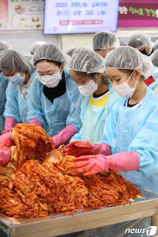 (대구=뉴스1) 공정식 기자 = 6일 오후 대구 중구 봉산동 경북사대부설초등학교에서 열린 '온(溫) 사랑 김장 나눔' 행사에 참여한 학생·학부모와 교사들이 교내 텃밭에서 직접 가꾼 무·배추로 김장을 하고 있다. '2023 경대사대부초 사랑나눔 교육기부'의 일환으로 이날 담근 김장김치는 인근 복지관을 통해 지역 홀몸어르신에게 전달할 예정이다. 2023.12.6/뉴스1