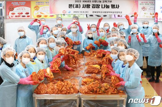 (대구=뉴스1) 공정식 기자 = 6일 오후 대구 중구 봉산동 경북사대부설초등학교에서 열린 '온(溫) 사랑 김장 나눔' 행사에 참여한 학생·학부모와 교사들이 교내 텃밭에서 직접 가꾼 무·배추로 김장을 하고 있다. '2023 경대사대부초 사랑나눔 교육기부'의 일환으로 이날 담근 김장김치는 인근 복지관을 통해 지역 홀몸어르신에게 전달할 예정이다. 2023.12.6/뉴스1