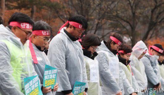 [서울=뉴스핌] 최지환 기자 = 나순자 보건의료노조 위원장(왼쪽 네번째)을 비롯한 노조원들이 6일 오후 서울 여의도 국회 앞에서 열린 공공병원 회복기 지원 예산 촉구 보건의료노조 대회에서 묵념을 하고 있다. 2023.12.06 choipix16@newspim.com 저작권자(c) 글로벌리더의 지름길 종합뉴스통신사 뉴스핌(Newspim), 무단 전재-재배포 금지