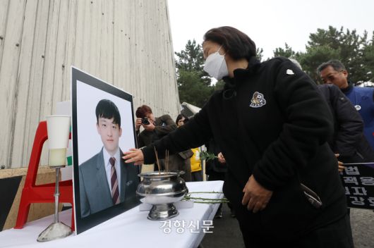 김미숙 김용균 재단 이사장이 충남 태안군 한국서부발전 태안발전본부에서 6일 열린 ‘고 김용균 5주기 현장추모제’에서 아들의 영정을 어루만지고 있다. |
