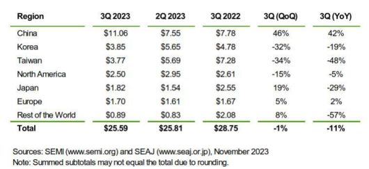 지역별로 보면 중국의 반도체 장비 매출액이 110억6000만달러로 전 분기에 이어 1위였다. 지난해 3분기와 비교하면 매출은 42% 증가했다.