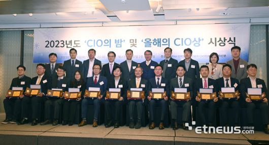 2023년 CIO의 밤 및 올해의 CIO상 시상식이 5일 서울 중구 웨스틴조선호텔에서 열렸다. 시상자와 수상자들이 단체 기념촬영 했다. 뒷줄 왼쪽부터 문정현 한국정보산업연합회 전무, 정현석 동양미래대 교수, 강병준 전자신문 대표, 김홍선 SC제일은행 부행장, 김병윤 한국CIO포럼 회장, 정진섭 한국정보산업연합회장, 유은종 한국정보산업연합회 상근부회장, 이경배 에이위즈 대표이사, 이지현 라이나원 대표이사, 이준호 한국화웨이 전무.