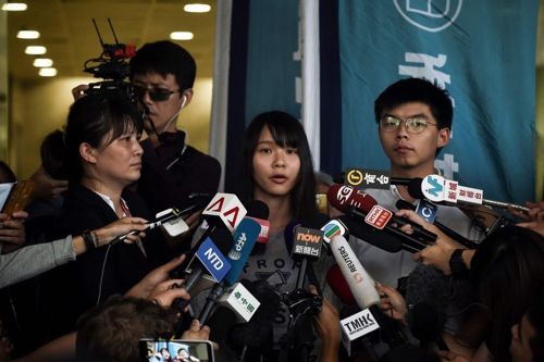 홍콩 민주화 활동가인 아그네스 차우(가운데)와 조슈아 웡(오른쪽)이 2019년 8월 홍콩 법원에서 보석으로 풀려난 뒤 언론 인터뷰를 하고 있다. AFP연합뉴스 |