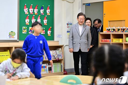 (서울=뉴스1) 국회사진취재단 = 이재명 더불어민주당 대표가 6일 서울 강서구 방화초등학교에서 ’온동네 초등돌봄' 현장간담회에 참석하기 전 돌봄교실을 둘러보고 있다. 2023.12.6/뉴스1