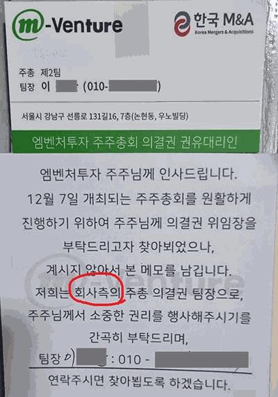 엠벤처투자 경영권을 두고 홍성혁 전 대표와 수앤파트너스가 분쟁 중이다. 사진은 홍 전 대표 측이 의결권 위임 권유를 위해 남긴 메모. 수앤파트너스 측은 '회사측'이라는 단어가 사칭이라는 입장이다. /엠벤처투자 |