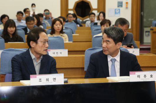 조희연 서울시교육감이 22일 서울 영등포구 국회 의원회관에서 열린 ‘공교육 디지털 개혁 방안’ 정책현안 토론회에 참석해 이주호 사회부총리 겸 교육부 장관과 대화하고 있다. 서울시교육청 제공 |