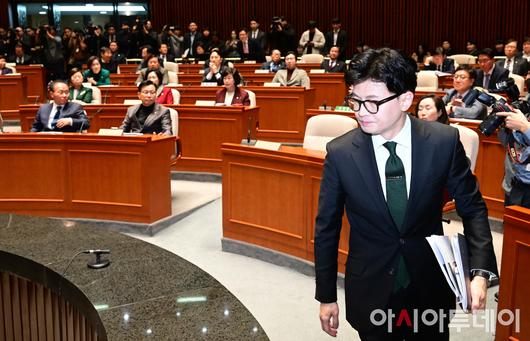 아시아투데이 이병화 기자 = 한동훈 법무부 장관이 6일 국회에서 열린 국민의힘 정책의원총회에서 출입국 이민관리청 신설 방안에 대해 설명하기 위해 단상으로 향하고 있다. ⓒ "젊은 파워, 모바일 넘버원 아시아투데이"