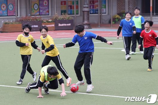 (대구=뉴스1) 공정식 기자 = 대설(大雪)을 하루 앞둔 6일 평년기온을 웃도는 포근한 날씨가 이어지자 대구 중구 경북사대부설초등학교 운동장에서 학생들이 가벼운 옷차림으로 축구를 하고 있다. 2023.12.6/뉴스1
