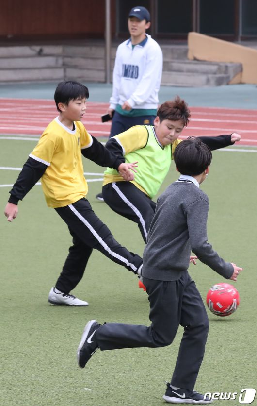 (대구=뉴스1) 공정식 기자 = 대설(大雪)을 하루 앞둔 6일 평년기온을 웃도는 포근한 날씨가 이어지자 대구 중구 경북사대부설초등학교 운동장에서 학생들이 가벼운 옷차림으로 축구를 하고 있다. 2023.12.6/뉴스1jsgong@news1.krCopyright ⓒ 뉴스1. All rights reserved. 무단 전재 및 재배포, AI학습 이용 금지.
