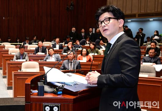 아시아투데이 이병화 기자 = 한동훈 법무부 장관이 6일 국회에서 열린 국민의힘 정책의원총회에서 출입국 이민관리청 신설 방안에 대해 설명하고 있다.