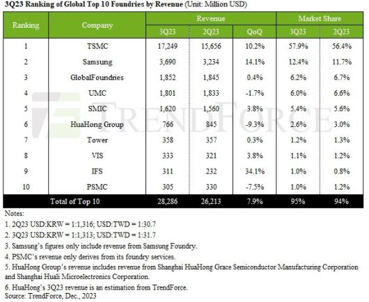 트렌드포스는 "스마트폰과 노트북 주문이 증가하면서 3분기 파운드리 산업은 호황을 맞았다"며 "특히 TSMC와 삼성의 고비용 3나노 제조 공정은 매출에 긍정적인 영향을 미쳤다"고 밝혔다.