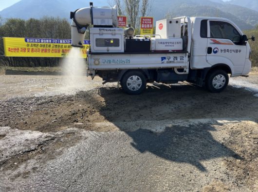 구례군 공동방제단이 조류인플루엔자 예방을 위한 방역 활동을 하고 있다. |
