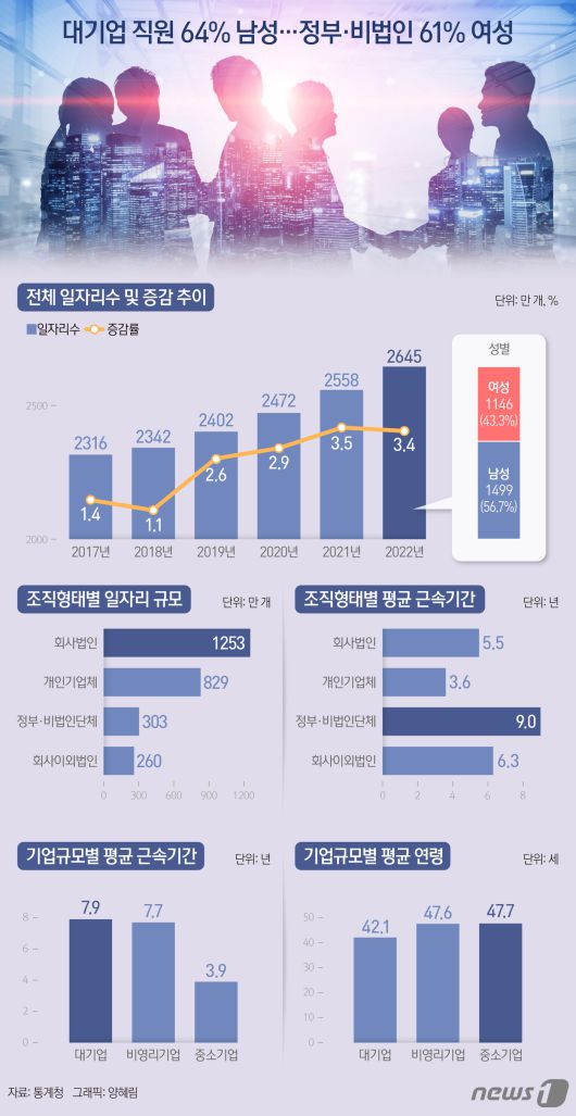 (서울=뉴스1) 양혜림 디자이너 = 지난해 대기업은 남성 일자리가, 정부·비법인단체는 여성 일자리가 더 많았던 것으로 나타났다. 통계청이 6일 발표한 '2022년 일자리행정통계 결과'에 따르면 지난해 총 일자리는 2645만개로 전년 대비 87만개(3.4%) 증가했다. 성별로 보면 남성의 일자리가 1499만개로 56.7%를, 여성 일자리는 1146만개로 43.3%를 각각 차지했다.