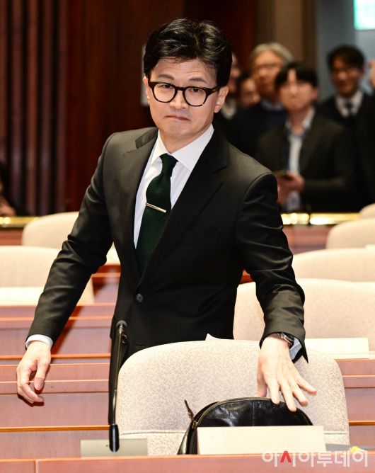 아시아투데이 이병화 기자 = 한동훈 법무부 장관이 6일 국회에서 열린 국민의힘 정책의원총회에 참석하고 있다.