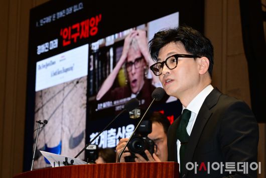 아시아투데이 이병화 기자 = 한동훈 법무부 장관이 6일 국회에서 열린 국민의힘 정책의원총회에서 출입국 이민관리청 신설 방안에 대해 설명하고 있다. ⓒ "젊은 파워, 모바일 넘버원 아시아투데이"