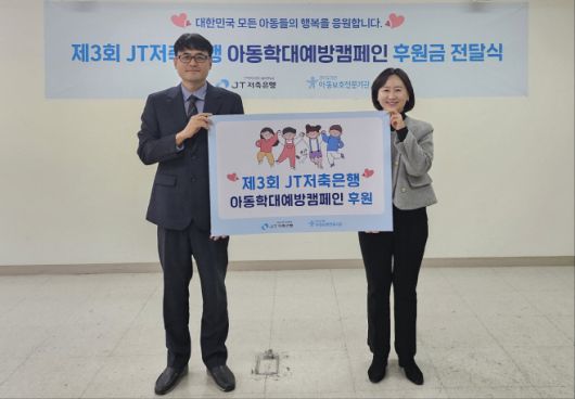 JT저축은행은 지난 5일 분당 본사에서 경기도거점 아동보호기관과 '제3회 아동학대예방캠페인 후원금 전달식'을 갖고 후원금 2200만원을 전달했다. 이날 전달식에는 박중용 JT저축은행 대표이사와 김민애 경기도거점아동보호전문기관 관장이 참석했다.