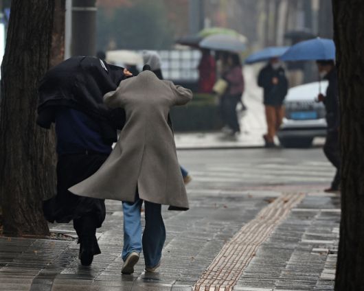 절기상 대설을 하루 앞두고 전국 곳곳에 비가 내린 6일 오후 서울 청계천인근 인도에서 우산을 미처 준비하지 못한 시민들이 외투로 비를 가리며 길을 지나고 있다. /연합뉴스 |