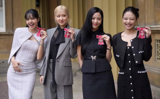 걸그룹 블랙핑크가 22일(현지시간) 영국 런던 버킹엄궁에서 열린 문화 예술인 격려 행사에서 찰스 3세 국왕에게 받은 대영제국훈장을 들어 보이고 있다. 왼쪽부터 리사, 로제, 지수, 제니. 2023.11.23 AFP 연합뉴스 |