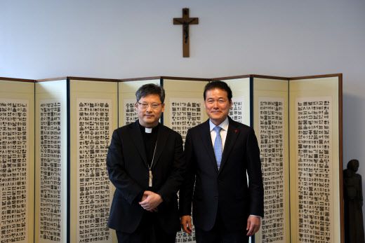 [이데일리 이윤정 기자] 천주교 서울대교구장 정순택 대주교는 6일 오전 교구장 접견실에서 김영호 통일부 장관을 접견했다. 이날 접견 자리에서는 2027년 서울에서 개최되는 세계청년대회와 한반도 평화 구축 방법에 대한 이야기가 오갔다.