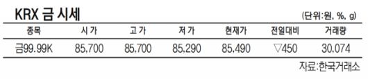 이날 금 가격은 전일대비 450원(0.52%) 내린 1g당 8만 5490원으로 장을 마감했다. 거래량과 거래대금은 각각 3만 74g, 25억 6881만원을 기록했다.