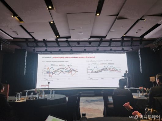 미국 금리 인하 시점은 내년 하반기로 전망했다. 커쉬 이코노미스트는 "미국의 경우 내년 하반기 정책금리가 하락할 것"이라며 "시장의 예상만큼 큰 폭으로 줄어들지는 않을 것"이라고 내다봤다.