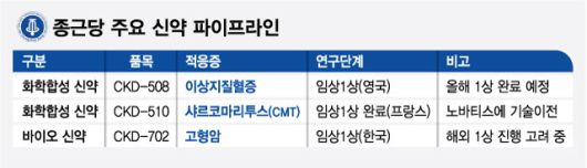 종근당은 샤르코마리투스(CMT) 치료제로 개발하고 있는 CKD-510을 글로벌 제약사 노바티스에 기술이전했다고 지난달 발표했다. 총 13억500만달러(약 1조7000억원) 규모의 대형 계약이다. 샤르코마리투스병은 전 세계에 약 280만명의 환자가 있는 희귀질환이다. 아직 마땅한 치료제가 없어 미충족 의료 수요가 높다. 종근당이 자체적으로 진행한 전임상과 임상 1상에서 안전성과 내약성을 확인했다.