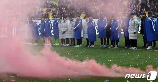 2일 오후 경기도 수원시 팔달구 수원월드컵경기장에서 열린 2023 하나원큐 K리그1 38라운드 수원삼성과 강원FC의 경기에서 0대0으로 비기며 2부리그 강등이 확정된 수원삼성 선수들이 서포터즈석 앞에서 그라운드로 날아온 연막탄을 바라보고 있다. 2023.12.2/뉴스1 ⓒ News1 박정호 기자 |