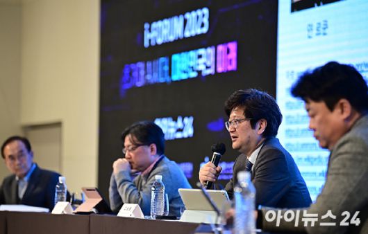 '챗GPT' 등장과 함께 AI 시대가 성큼 다가온 가운데 관련 산업의 현재와 미래를 살펴볼 수 있는 '아이포럼 2023'이 '초거대 AI 시대, 대한민국의 미래'라는 주제로 6일 서울 용산구 드래곤시티 호텔 3층 한라홀에서 열렸다. 김준범 네이버클라우드 상무가 좌담회를 진행하고 있다. [사진=곽영래 기자] |