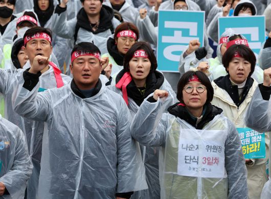 양경수 민주노총 위원장과 나순자 전국보건의료산업노동조합 위원장(오른쪽)을 비롯한 조합원들이 6일 오후 서울 영등포구 여의도 국회 앞에서 열린 결의대회에서 공공의료 강화 및 의료진 확충, 공공병원(감염병 전담병원) 회복기 지원 예산 확대 등을 촉구하며 구호를 외치고 있다. /뉴스1 |