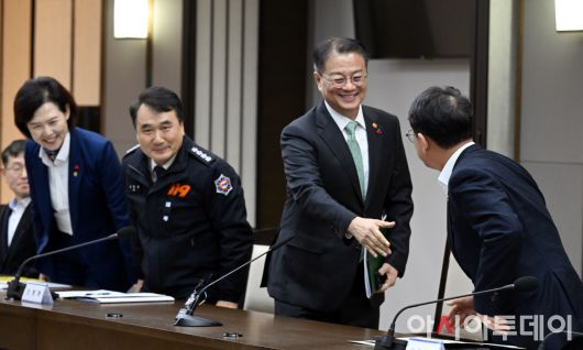아시아투데이(세종) 박성일 기자 = 방기선 국무조정실장(오른쪽에서 두번째)이 6일 오후 세종시 정부세종청사에서 열린 외청장회의에 참석해 참석자들과 인사를 하고 있다. |