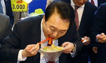 윤석열 대통령이 6일 부산 중구 깡통시장을 방문해 떡볶이와 빈대떡을 시식하고 있다. 대통령실사진기자단 |