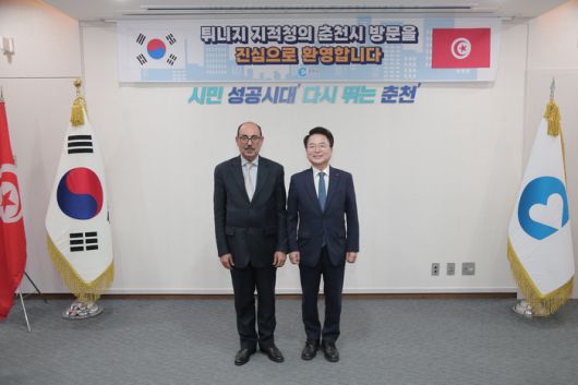 카멜 아메드(KAMEL Ahmed) 튀니지 국토부 지적청장(사진 왼쪽)과 육동한 춘천시장이 기념촬영을 하고 있다. 사진|춘천시청 |