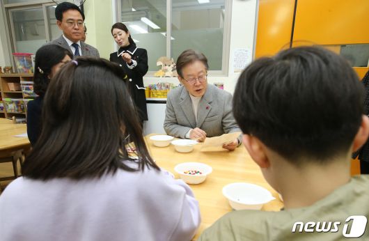 (서울=뉴스1) 국회사진취재단 = 이재명 더불어민주당 대표가 6일 오후 서울 강서구 방화초등학교에서 '온동네 초등돌봄' 정책 현장간담회에 앞서 돌봄 교실을 찾아 이야기를 나누고 있다. 2023.12.6/뉴스1