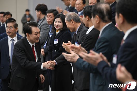 (서울=뉴스1) 오대일 기자 = 윤석열 대통령이 6일 부산 동구 부산항국제전시컨벤션센터에서 열린 '부산시민의 꿈과 도전 격려 간담회'에서 참석자들과 인사를 나누고 있다. (대통령실 제공) 2023.12.6/뉴스1kkorazi@news1.krCopyright ⓒ 뉴스1. All rights reserved. 무단 전재 및 재배포, AI학습 이용 금지.
