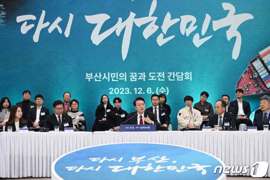 (서울=뉴스1) 오대일 기자 = 윤석열 대통령이 6일 부산 동구 부산항국제전시컨벤션센터에서 열린 '부산시민의 꿈과 도전 격려 간담회'에서 모두발언을 하고 있다. (대통령실 제공) 2023.12.6/뉴스1
