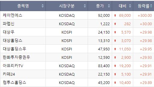 대상 우선주는 29.98% 오른 2만4150원을 기록했다. 대상홀딩스와 대상홀딩스 우선주는 각각 29.98%. 29.95% 급등한 1만3310원, 4만7950원이었다.