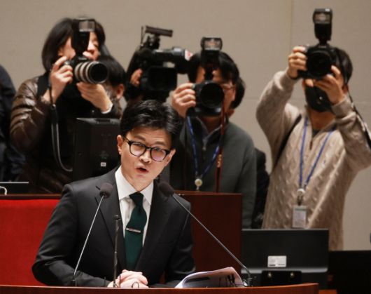 한동훈에 쏠린 눈 - 한동훈 법무부 장관이 6일 국회 예결위회의장에서 열린 국민의힘 정책의원총회에서 ‘출입국 이민관리청 신설 방안’에 대해 제안설명을 하고 있다. 연합뉴스 |